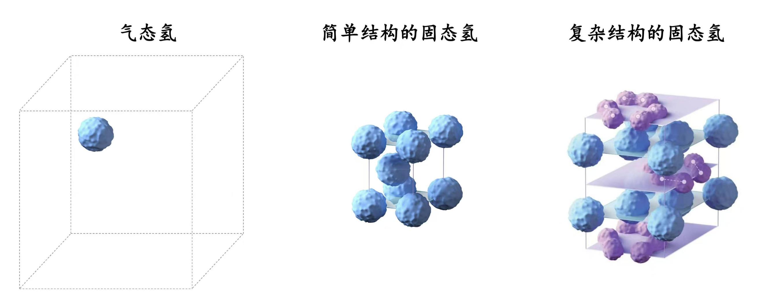 压力的升高,使氢的晶体结构趋于复杂。“气体氢的分子随机散落在空间中。随压力升高(5GPa),氢分子像跳棋子一样层层排列,形成固体氢。压力再升高(212-245GPa),一部分氢原子会形成蜂窝状排列,于是固体氢呈现更复杂的结构:跳棋子和蜂窝间隔着层层叠起。”论文第一作者、北京高压科学研究中心研究员吉诚说。